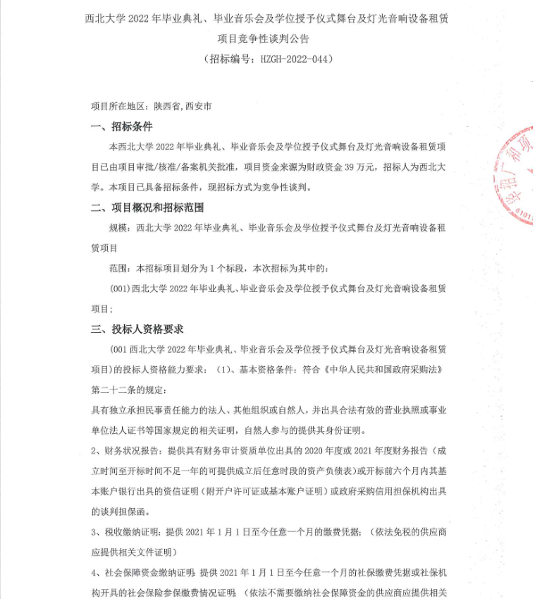 西北大学2022年毕业典礼、毕业音乐会及学位授予仪式舞台及灯光音响设备租赁项目竞争性谈判公告