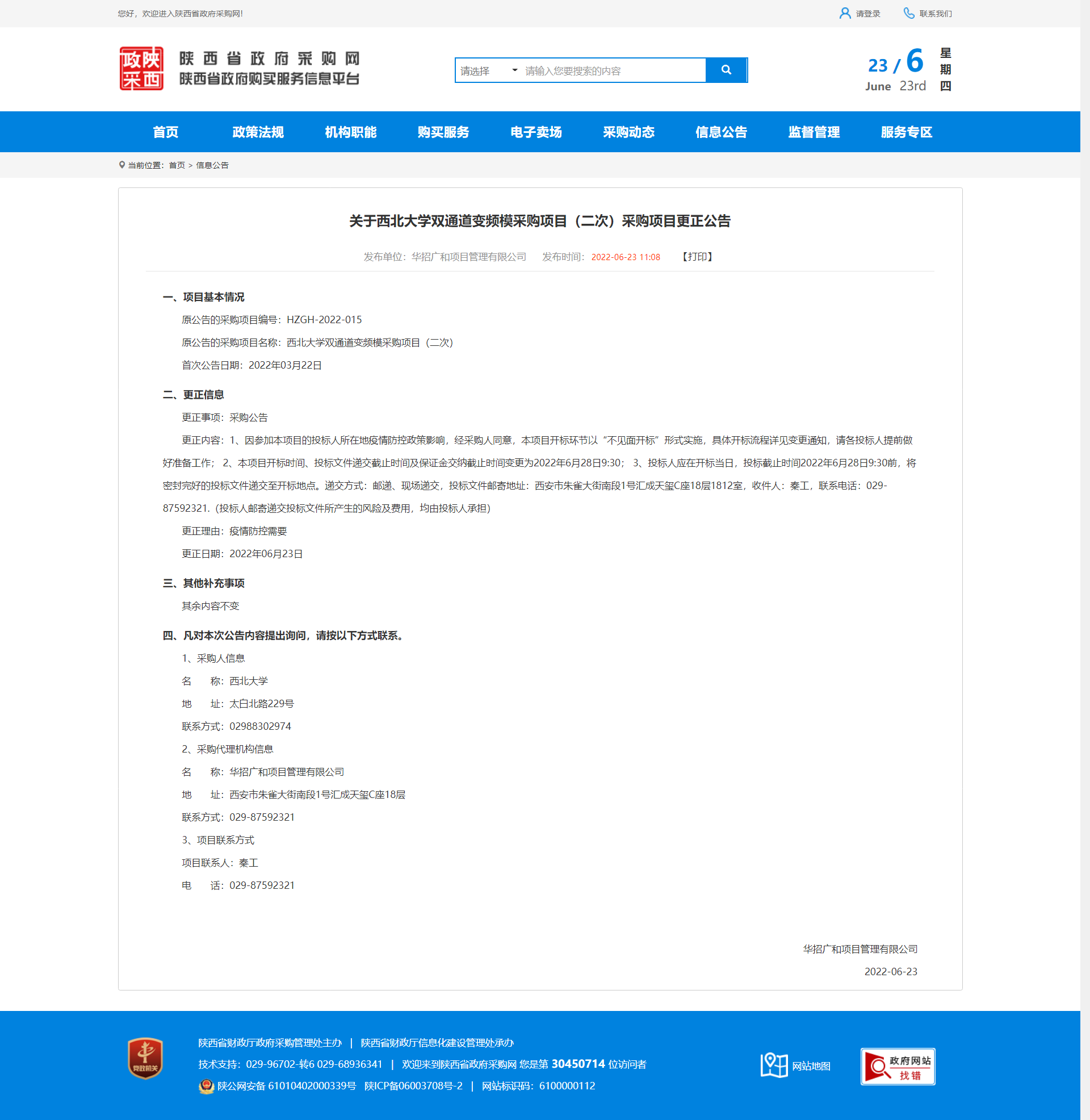 关于西北大学双通道变频模采购项目(二次)采购项目更正公告 作者: 编辑:薛利娟 时间:2022-06-23 原公告链接:http://113.200.80.230/notice/noticeDetail.do?noticeguid=8a85be3380b2b28401818e7fbfde4dfc