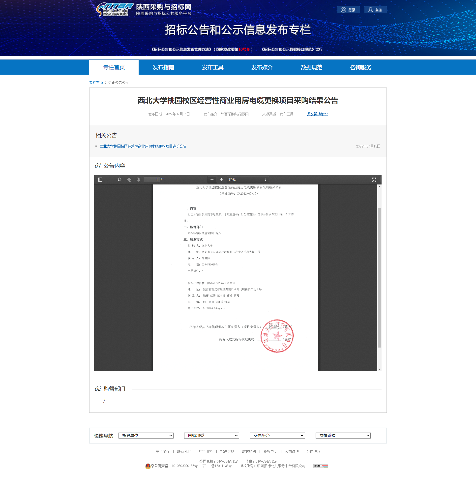 西北大学桃园校区经营性商业用房电缆更换项目采购结果公告 作者: 编辑:薛利娟 时间:2022-07-15 原公告链接:http://bulletin.sntba.com/changeBulletin/2022-07-15/447828.html