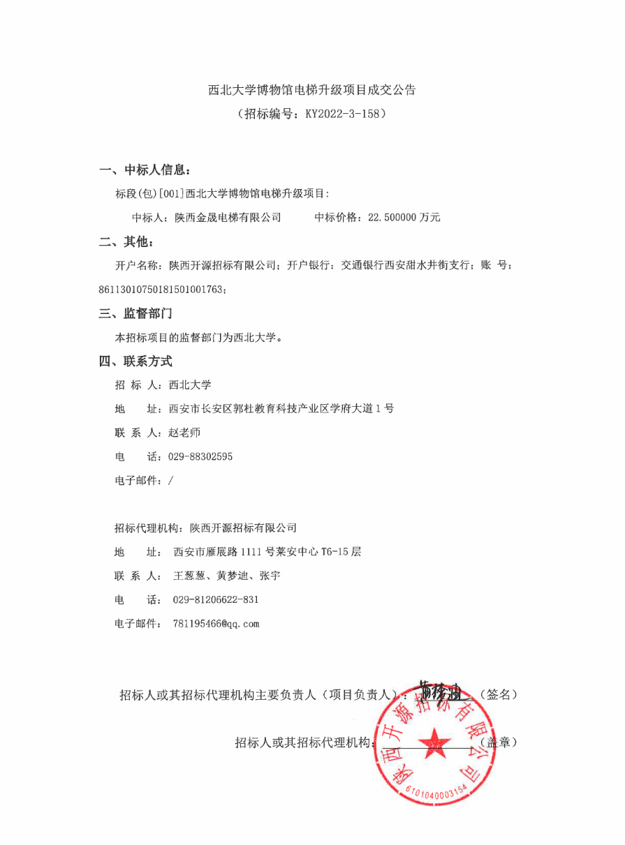西北大学博物馆电梯升级项目成交公告