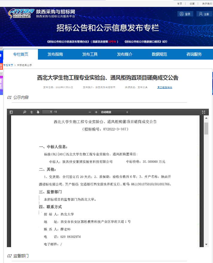 西北大学生物工程专业实验台、通风柜购置项目磋商成交公告 作者: 编辑:薛利娟 时间:2022-07-21 原公告链接:http://bulletin.sntba.com/resultBulletin/2022-07-21/450756.html