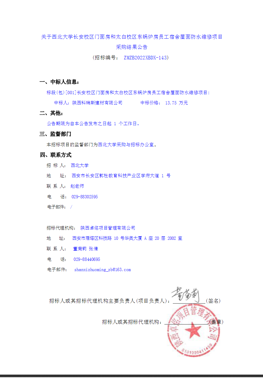 关于西北大学长安校区门面房和太白校区东锅炉房员工宿舍屋面防水维修项目采购结果公告