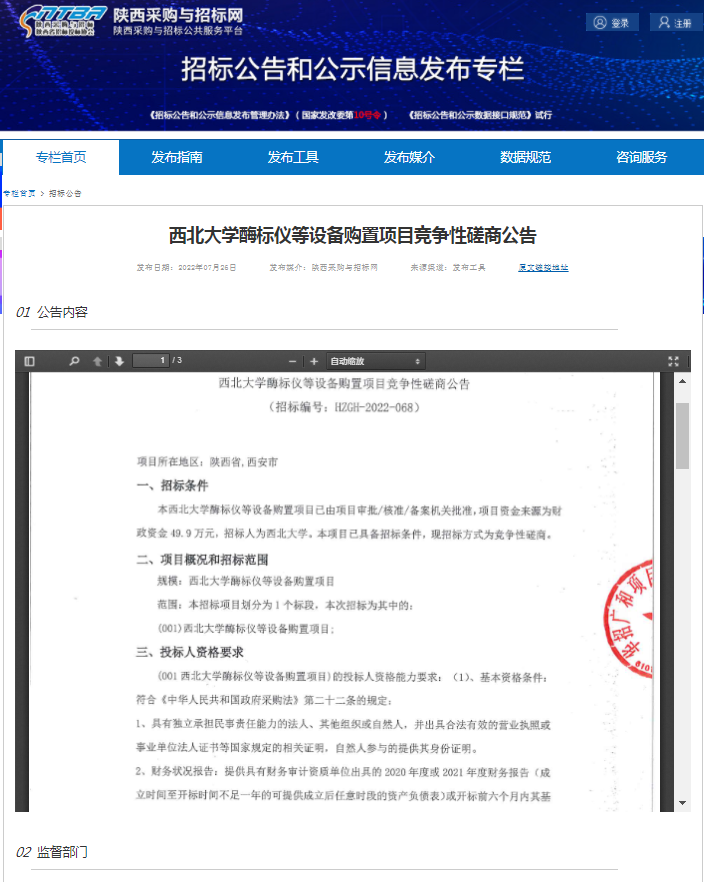 西北大学酶标仪等设备购置项目竞争性磋商公告 作者: 编辑:采购与招标办公室 时间:2022-07-26 原公告链接:http://bulletin.sntba.com/biddingBulletin/2022-07-26/452921.html