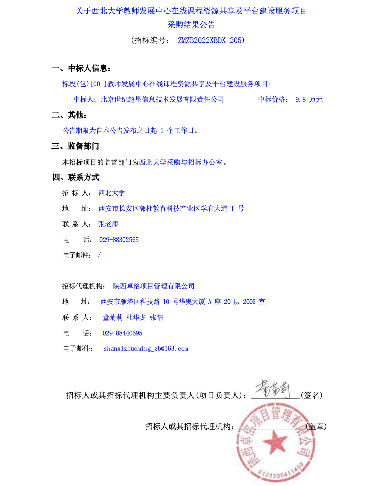 关于西北大学教师发展中心在线课程资源共享及平台建设服务项目采购结果公告