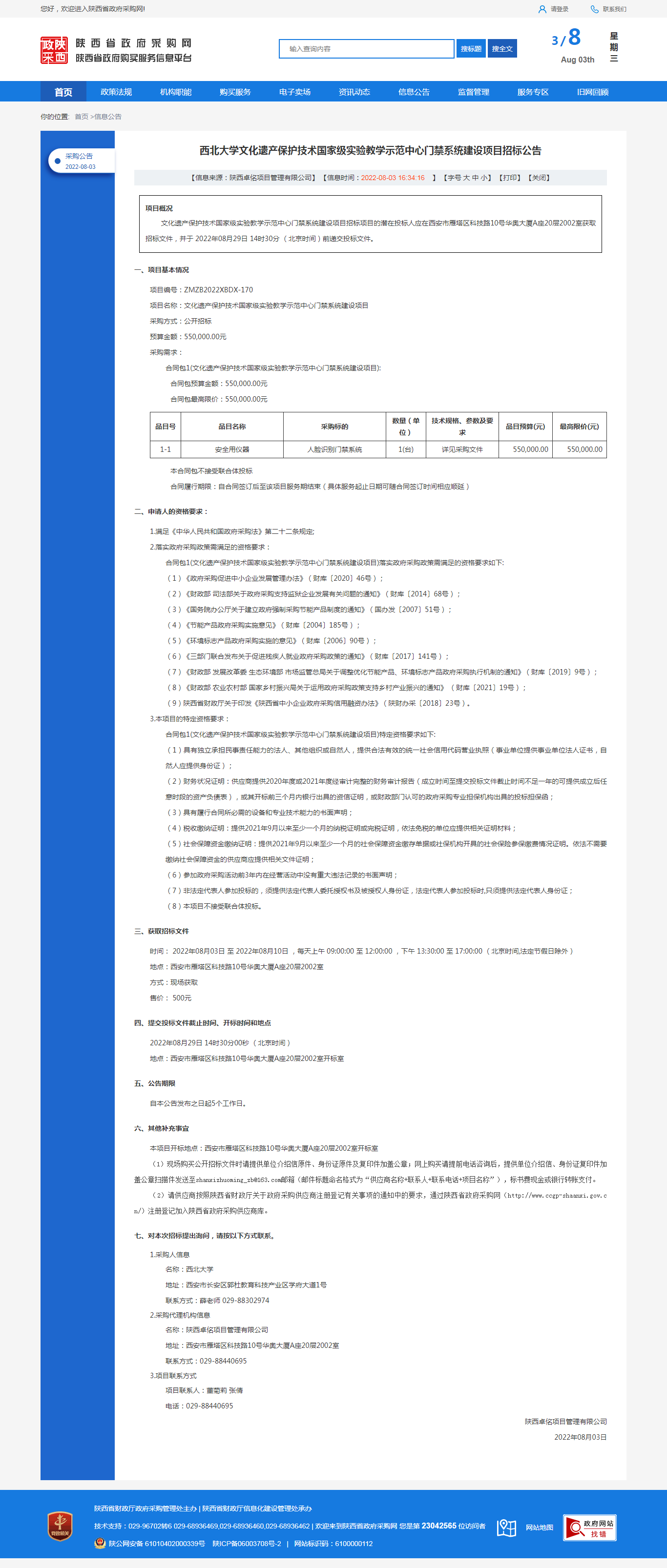 西北大学文化遗产保护技术国家级实验教学示范中心门禁系统建设项目招标公告 作者: 编辑:采购与招标办公室 时间:2022-08-03 原公告链接:http://www.ccgp-shaanxi.gov.cn/freecms/site/shaanxi/ggxx/info/2022/8a69c15f8238f00c01826158874944be.html?noticeType=001011¬iceId=795f6845-1307-11ed-9a8e-08c0eb20c666