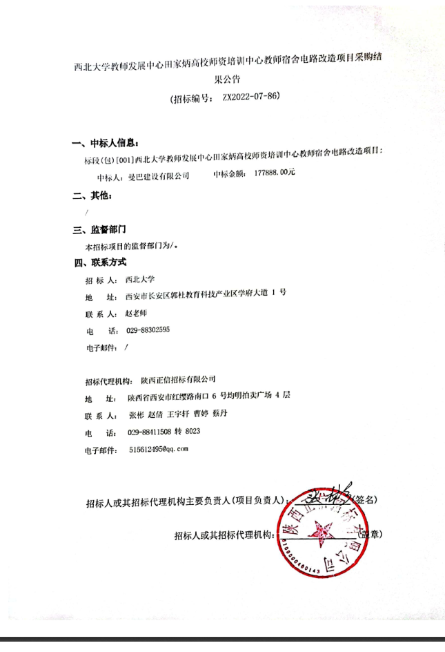 西北大学教师发展中心田家炳高校师资培训中心教师宿舍电路改造项目采购结果公告