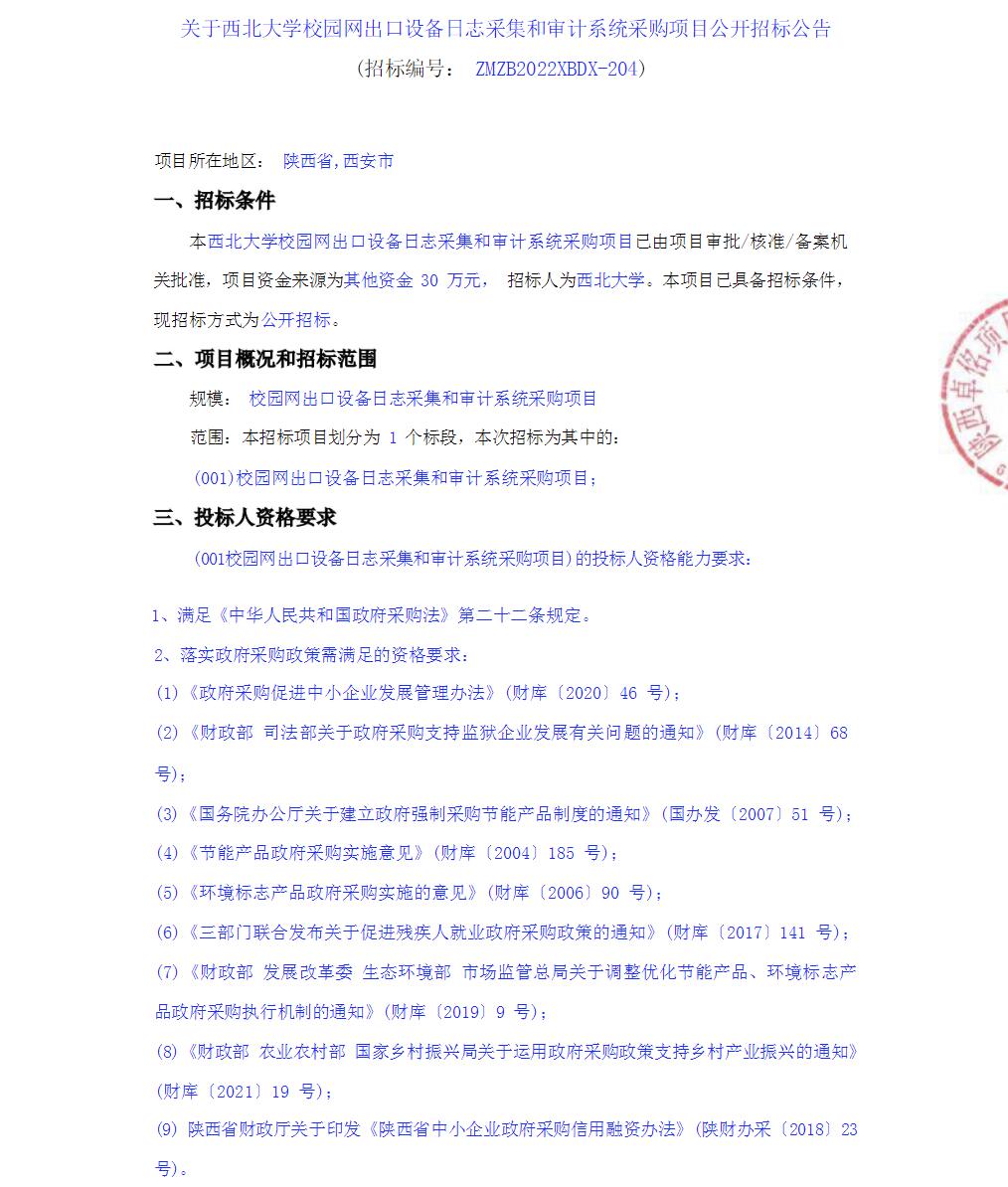 西北大学校园网出口设备日志采集和审计系统采购项目公开招标公告