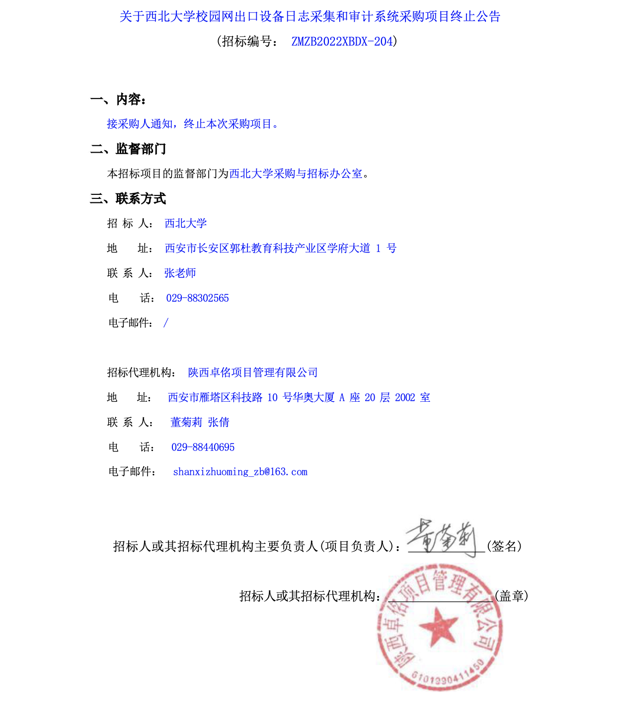 关于西北大学校园网出口设备日志采集和审计系统采购项目终止公告