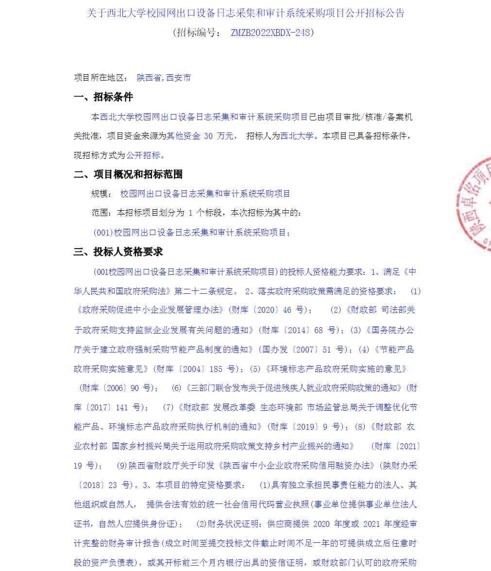 关于西北大学校园网出口设备日志采集和审计系统采购项目公开招标公告