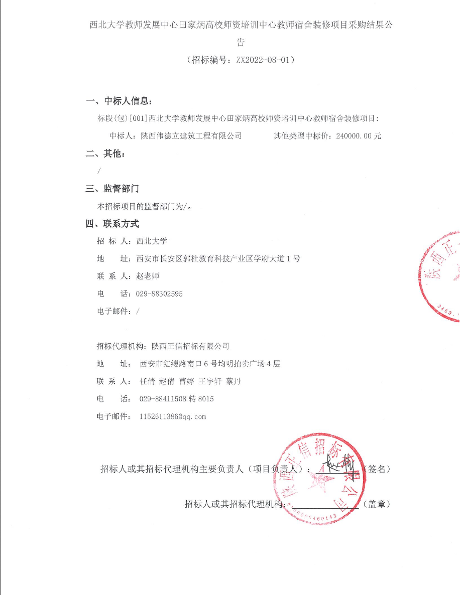 西北大学教师发展中心田家炳高校师资培训中心教师宿舍装修项目采购结果公告