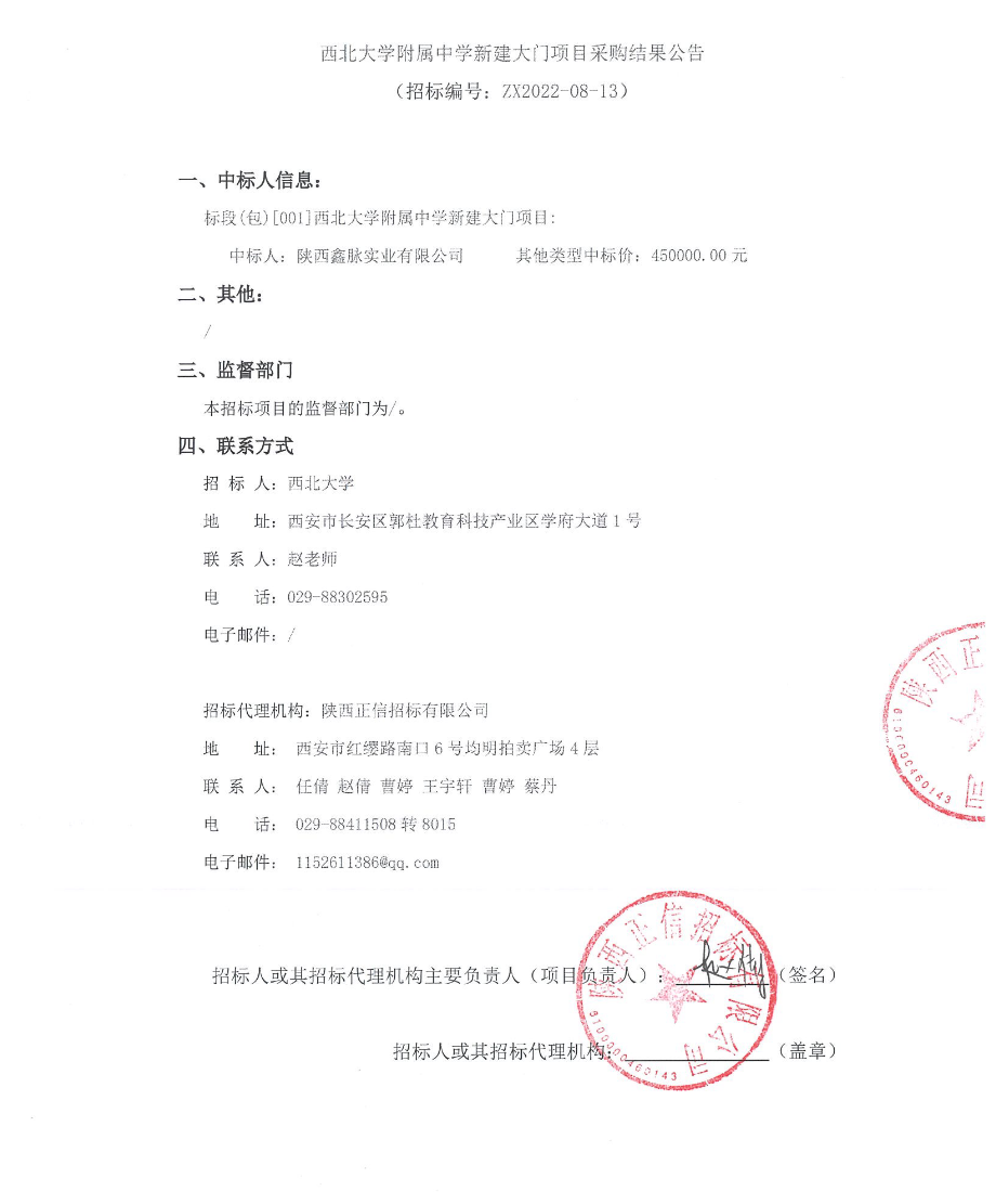 西北大学附属中学新建大门项目采购结果公告