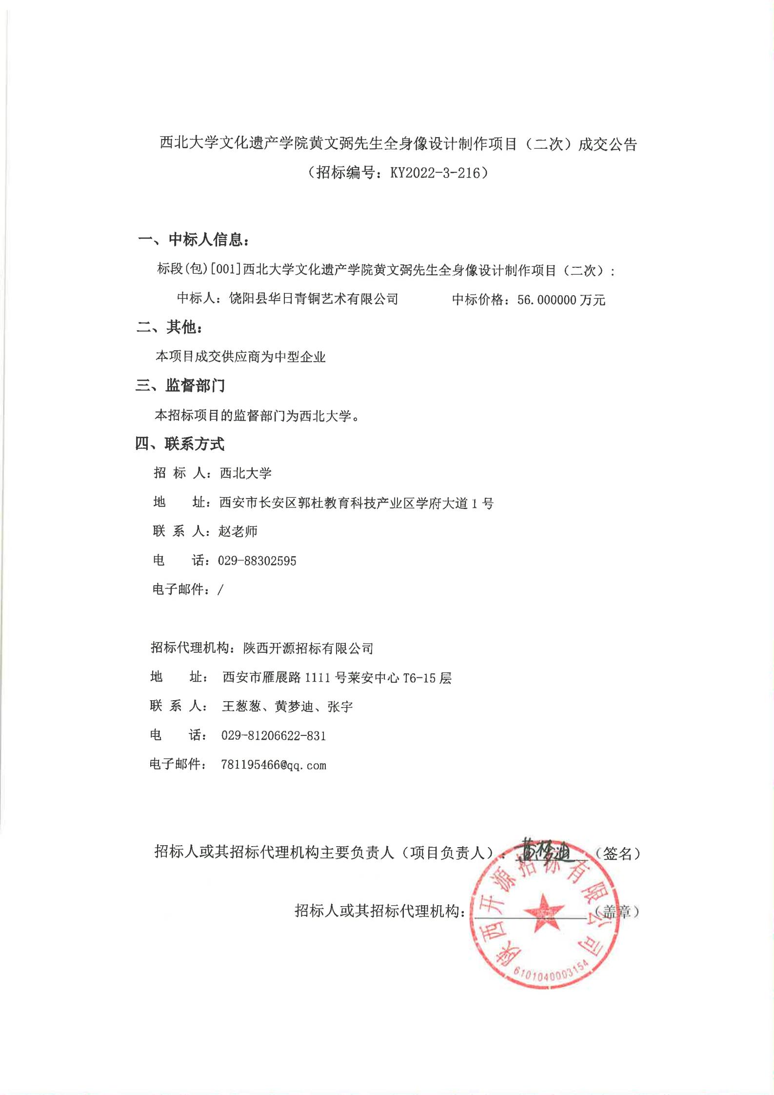 西北大学文化遗产学院黄文弼先生全身像设计制作项目(二次)成交公告