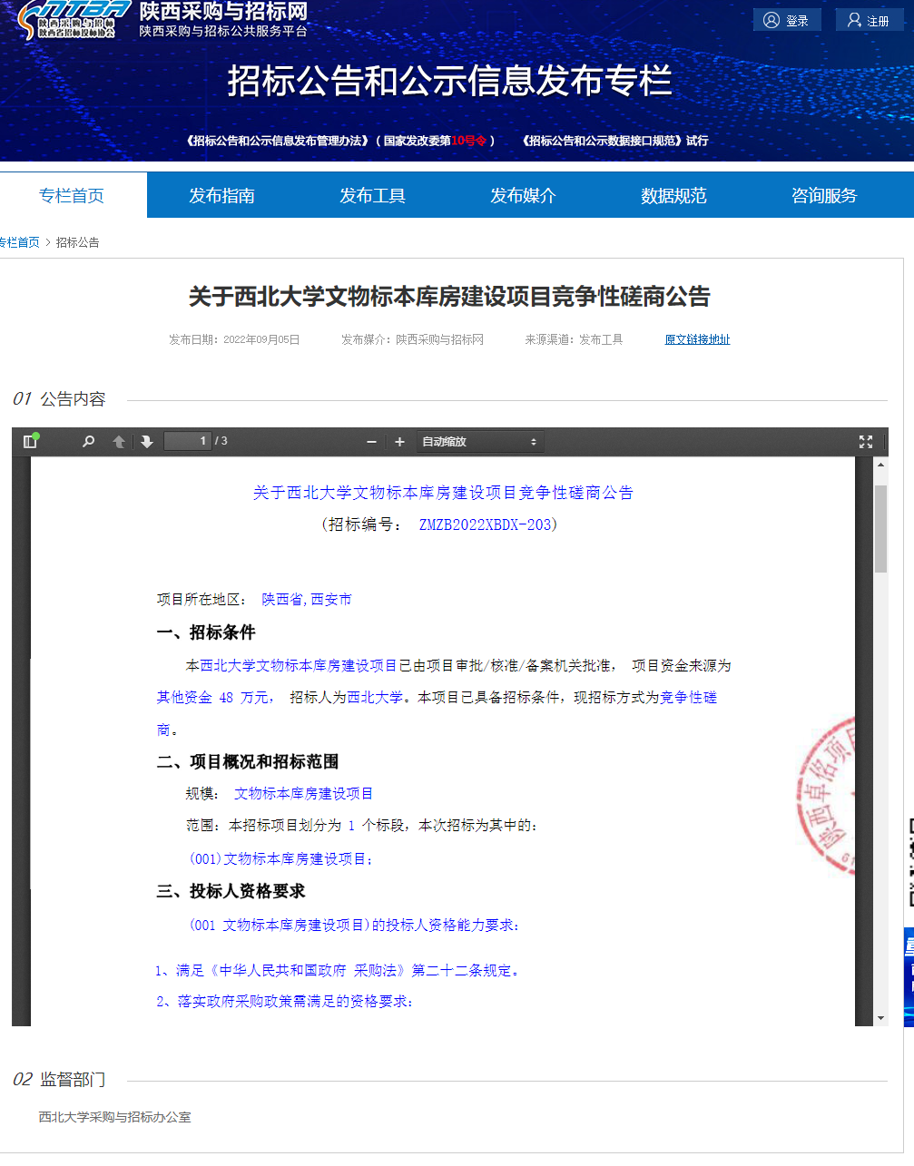 关于西北大学文物标本库房建设项目竞争性磋商公告 作者: 编辑:采购与招标办公室 时间:2022-09-06 原公告链接:http://bulletin.sntba.com/biddingBulletin/2022-09-05/470289.html