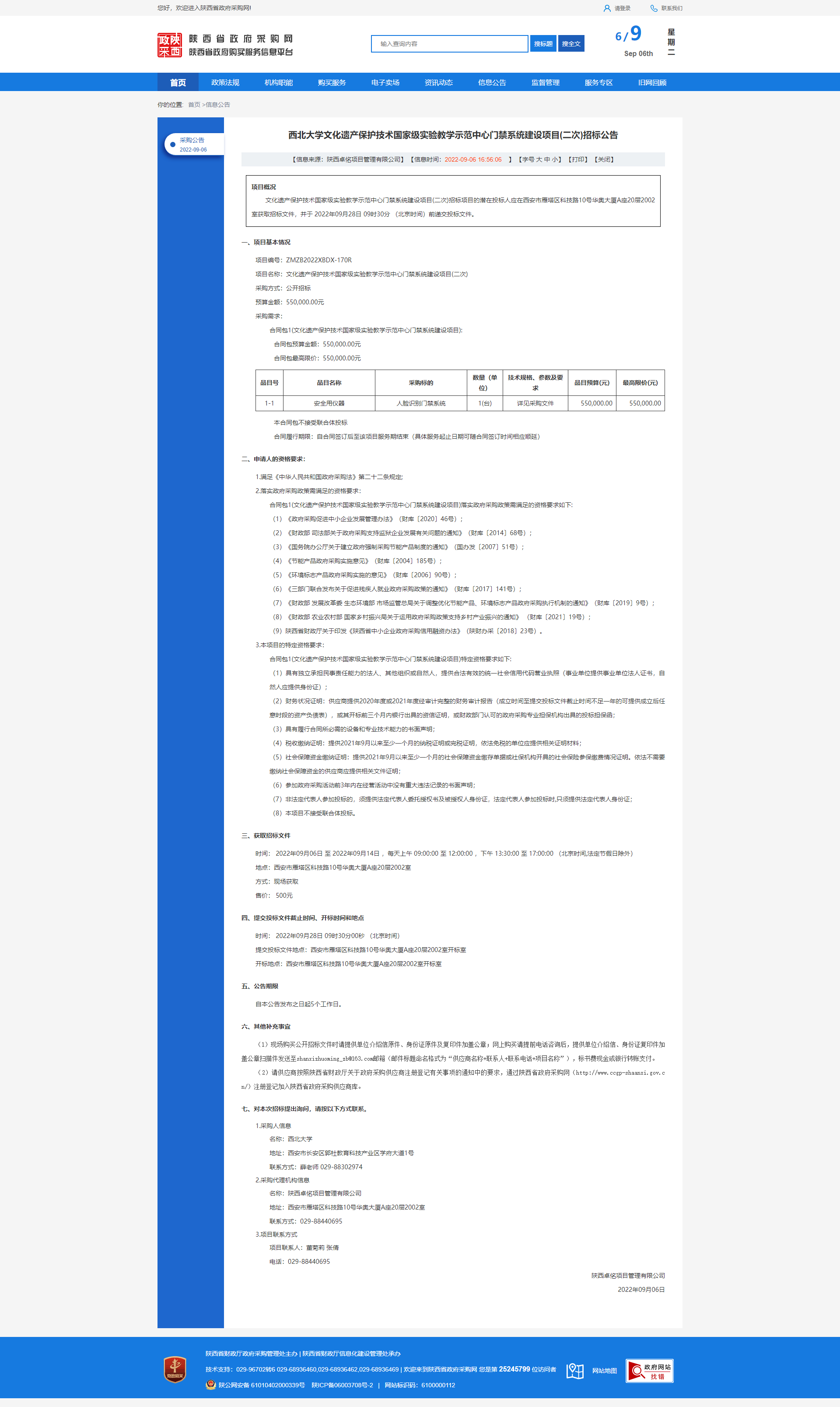 西北大学文化遗产保护技术国家级实验教学示范中心门禁系统建设项目(二次)招标公告 作者: 编辑:采购与招标办公室 时间:2022-09-06 原公告链接:http://www.ccgp-shaanxi.gov.cn/freecms/site/shaanxi/ggxx/info/2022/8a69c63182a32538018311f9ef2e1370.html?noticeType=001011¬iceId=3d8b61ff-2dc2-11ed-9a8e-08c0eb20c666