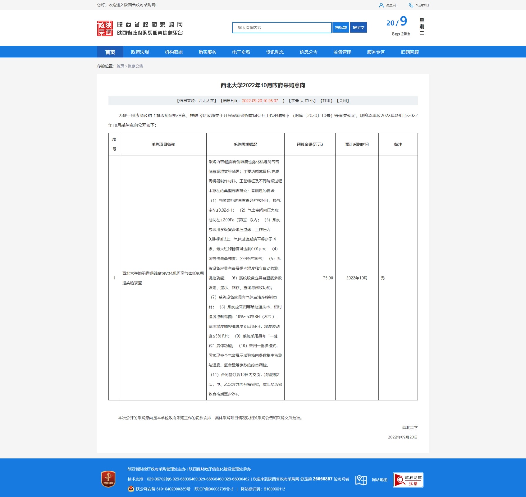 西北大学2022年10月政府采购意向 作者: 编辑:采购与招标办公室 时间:2022-09-20 原公告链接:http://www.ccgp-shaanxi.gov.cn/freecms/site/shaanxi/ggxx/info/2022/8a69c84783550299018358999f5835c8.html?noticeType=59¬iceId=956398b8-3889-11ed-9a8e-08c0eb20c666