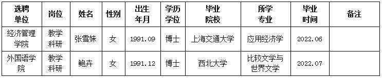 经用人单位推荐,人力资源部审查,学校教学督导及院系相关专家考核,我校拟确定下列人员来校工作。本着公平、公正、公开的原则,现将本次拟选聘人员基本情况公示如下: