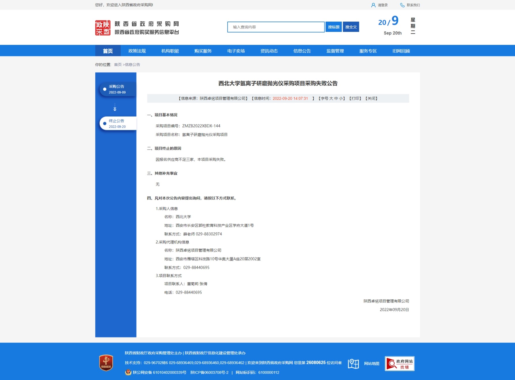 西北大学氩离子研磨抛光仪采购项目采购失败公告 作者: 编辑:采购与招标办公室 时间:2022-09-20 原公告链接:http://www.ccgp-shaanxi.gov.cn/freecms/site/shaanxi/ggxx/info/2022/8a69c4a282a3244b018359712fe50041.html?noticeType=001004¬iceId=078e12ef-38ab-11ed-9a8e-08c0eb20c666