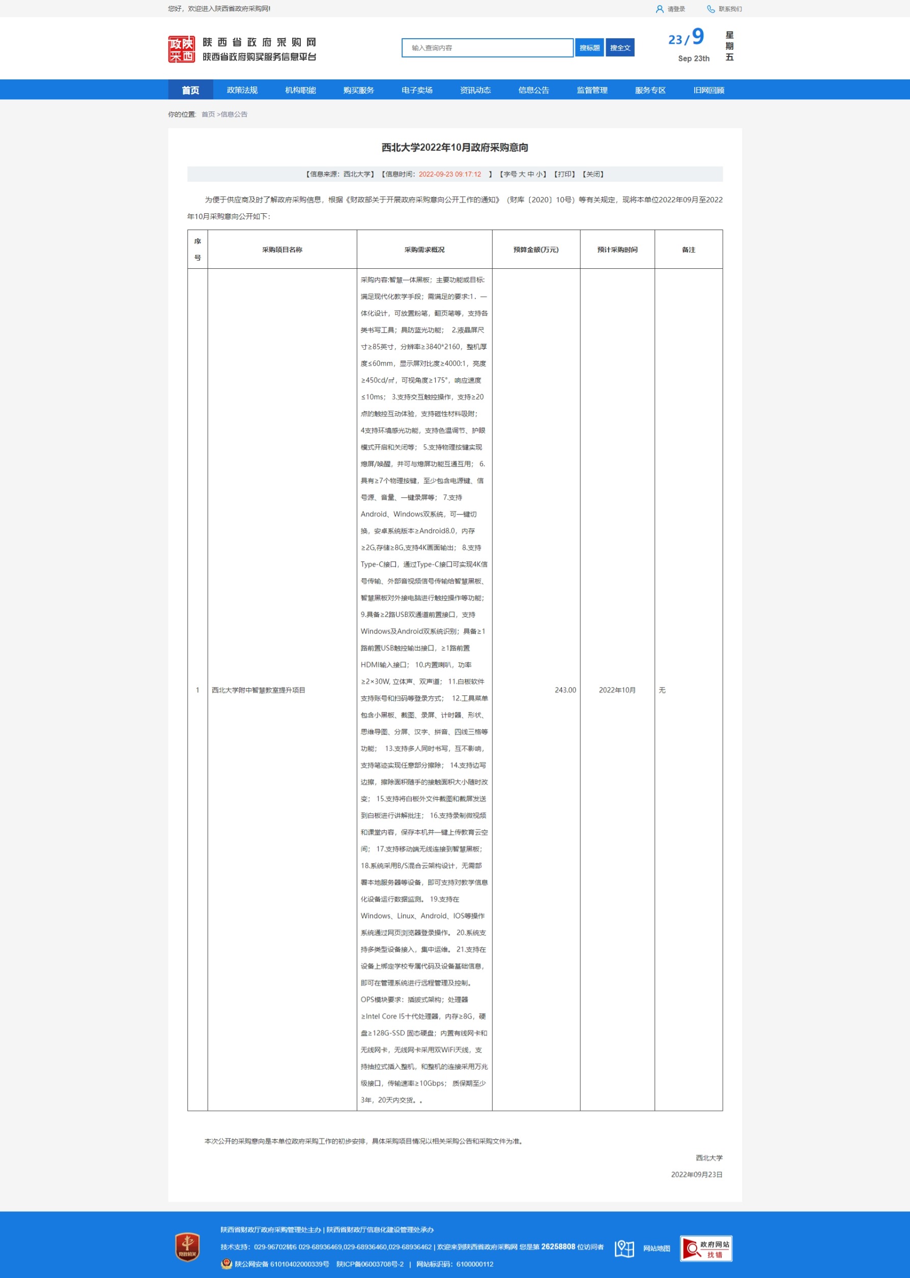 西北大学2022年10月政府采购意向 作者: 编辑:采购与招标办公室 时间:2022-09-23 原公告链接:http://www.ccgp-shaanxi.gov.cn/freecms/site/shaanxi/ggxx/info/2022/8a69c8478367db9a018367e5fec9035c.html?noticeType=59¬iceId=f95e3cc6-3add-11ed-9a8e-08c0eb20c666