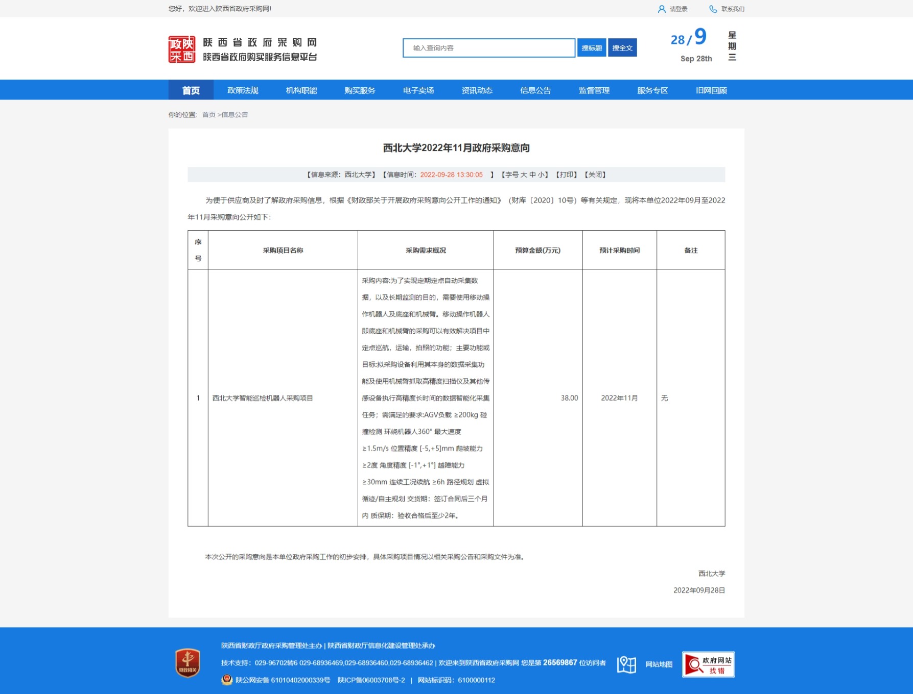 西北大学2022年11月政府采购意向 作者: 编辑:采购与招标办公室 时间:2022-09-28 原公告链接:http://www.ccgp-shaanxi.gov.cn/freecms/site/shaanxi/ggxx/info/2022/8a69c847837eb9fc0183828ef9c15ac6.html?noticeType=59¬iceId=23e036ab-3eef-11ed-9a8e-08c0eb20c666