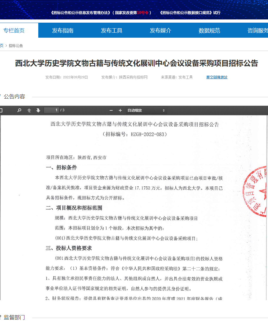 西北大学历史学院文物古籍与传统文化展训中心会议设备采购项目招标公告 作者: 编辑:西北大学历史学院文物古籍与传统文化展训中心会议设备采购项目招标公告 时间:2022-09-29 原公告链接:http://bulletin.sntba.com/biddingBulletin/2022-09-29/480759.html