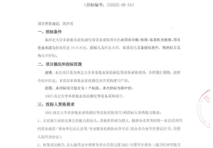西北大学多参数水质检测仪等设备采购项目公开招标公告 作者: 编辑:采购与招标办公室 时间:2022-11-03 原公告链接:http://bulletin.sntba.com/biddingBulletin/2022-11-03/494214.html