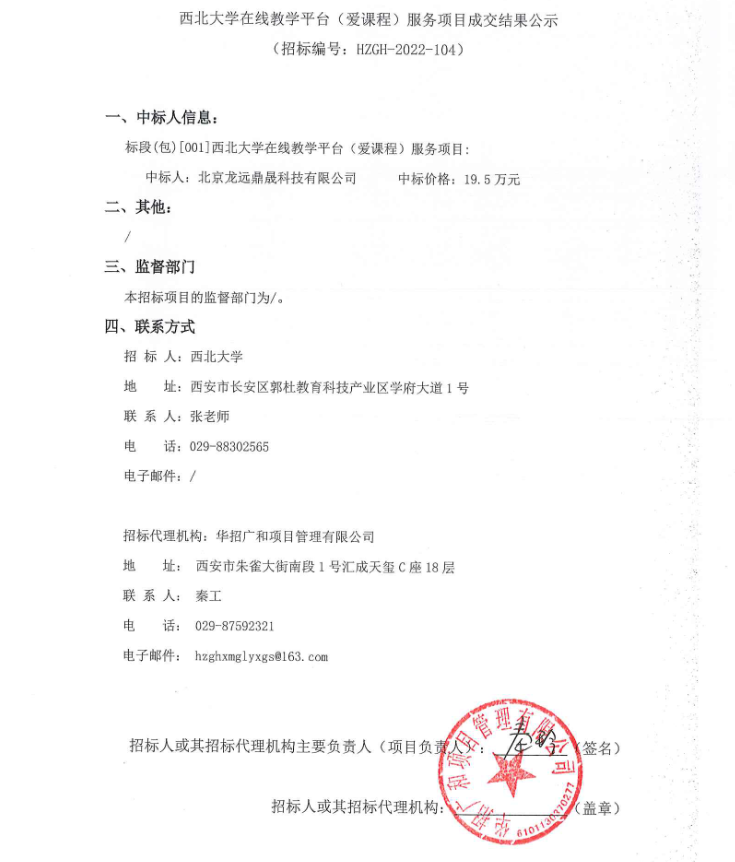 西北大学在线教学平台(爱课程)服务项目成交结果公示