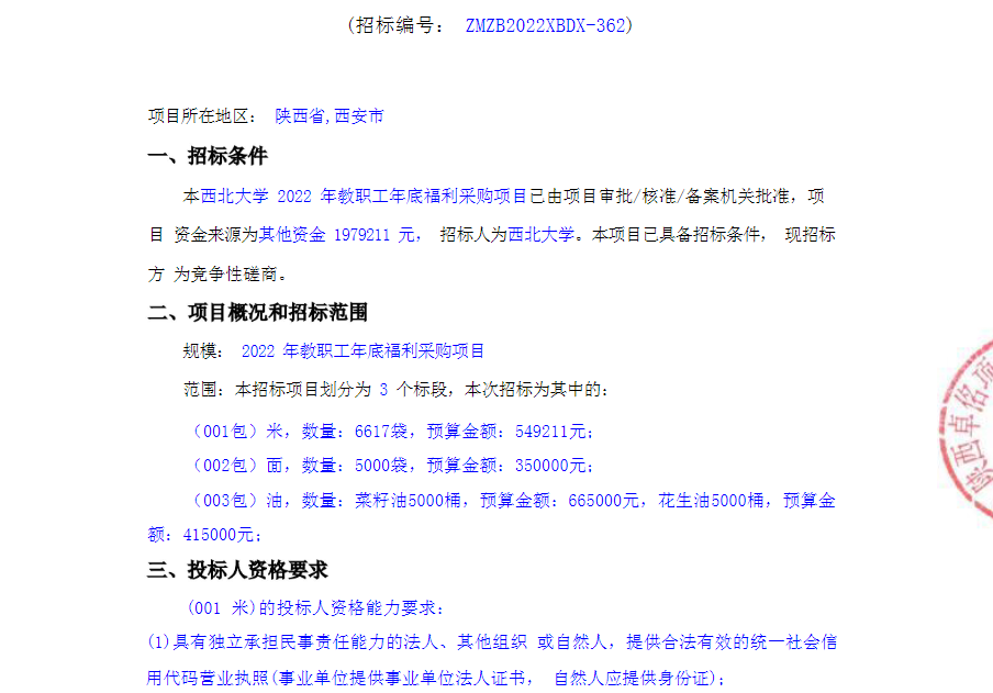西北大学2022年教职工年底福利采购项目竞争性磋商公告 作者: 编辑:采购与招标办公室 时间:2022-11-30 原公告链接:http://bulletin.sntba.com/biddingBulletin/2022-11-30/505034.html 更正公告链接:http://bulletin.sntba.com/changeBulletin/2022-11-30/505114.html