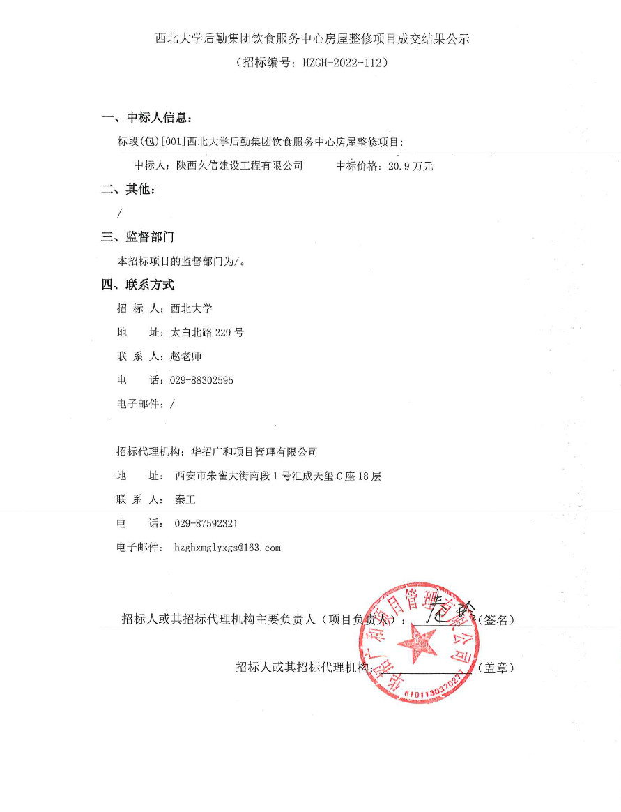 西北大学后勤集团饮食服务中心房屋整修项目成交结果公示