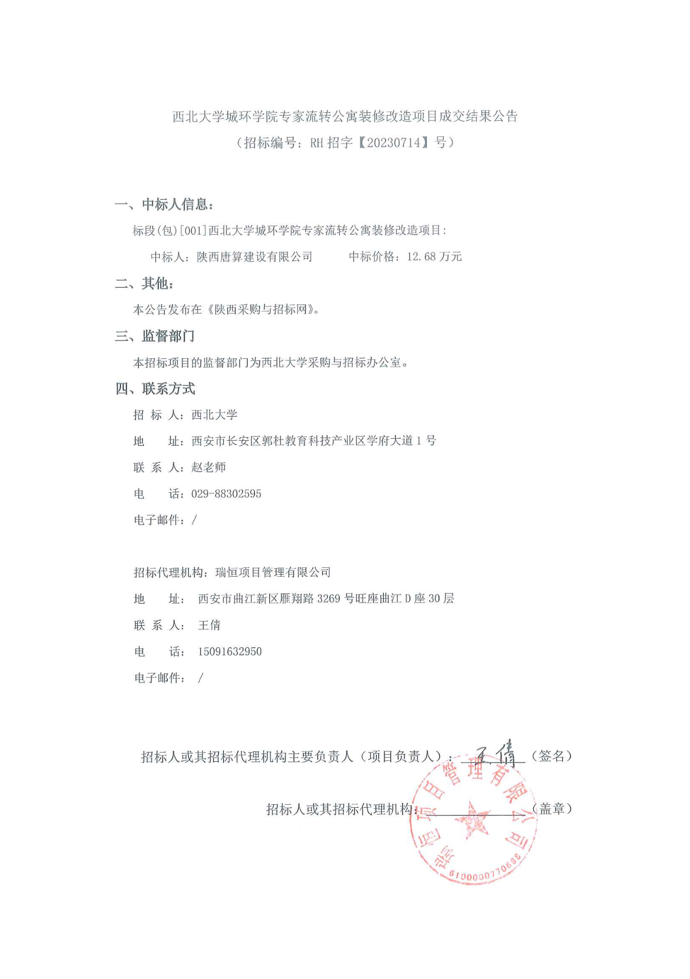 西北大学城环学院专家流转公寓装修改造项目成交结果公告