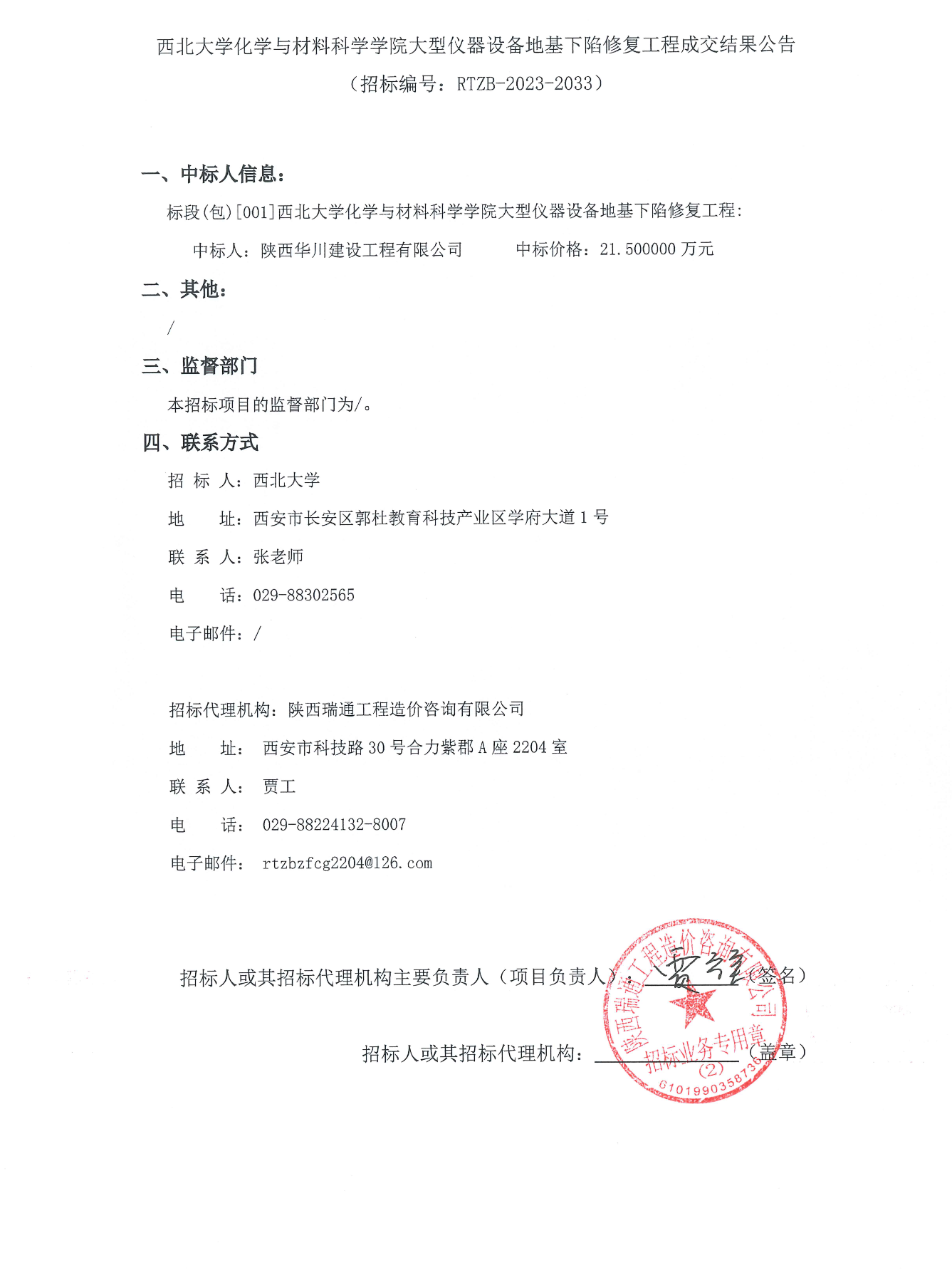西北大学化学与材料科学学院大型仪器设备地基下陷修复工程成交结果公告