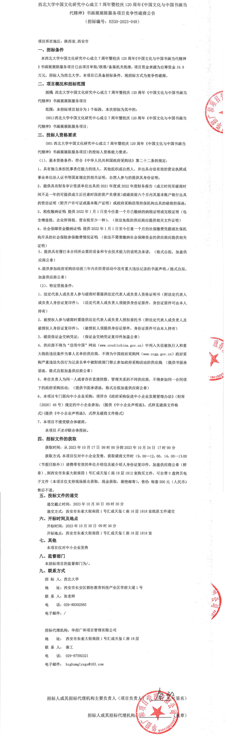 西北大学中国文化研究中心成立7周年暨校庆120周年《中国文化与中国书画当代精神》书画展展陈服务项目竞争性磋商公告