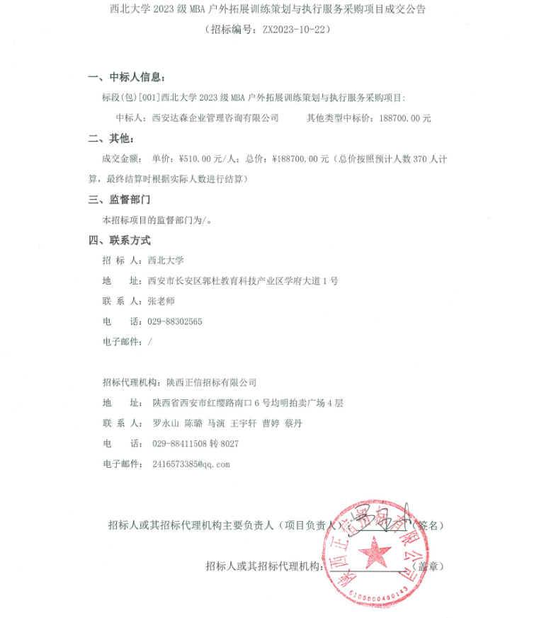 西北大学2023级MBA户外拓展训练策划与执行服务采购项目成交公告