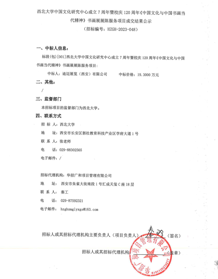 西北大学中国文化研究中心成立7周年暨校庆120周年《中国文化与中国书画当代精神》书画展展陈服务项目成交结果公示