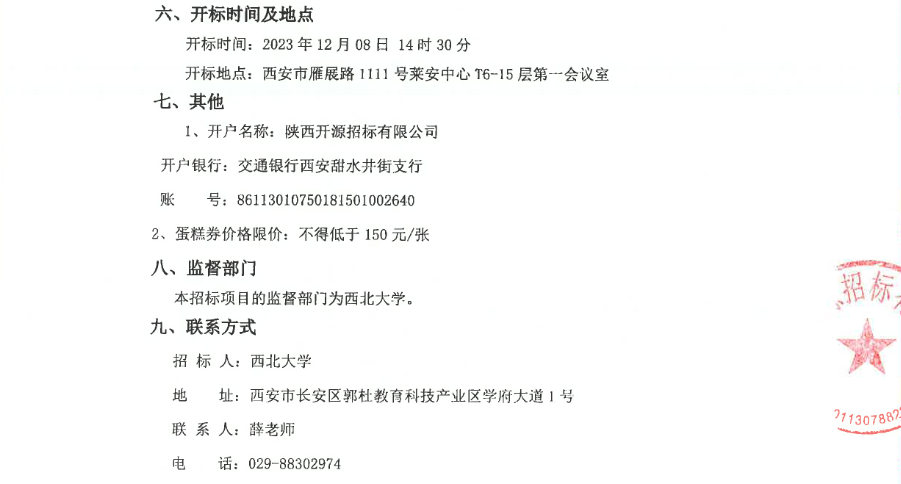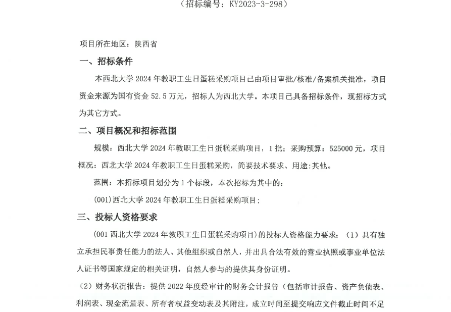 西北大学2024年教职工生日蛋糕采购项目竞争性磋商公告 作者: 编辑:采购与招标办公室 时间:2023-11-27 原公告链接:http://bulletin.sntba.com/biddingBulletin/2023-11-27/855167.html