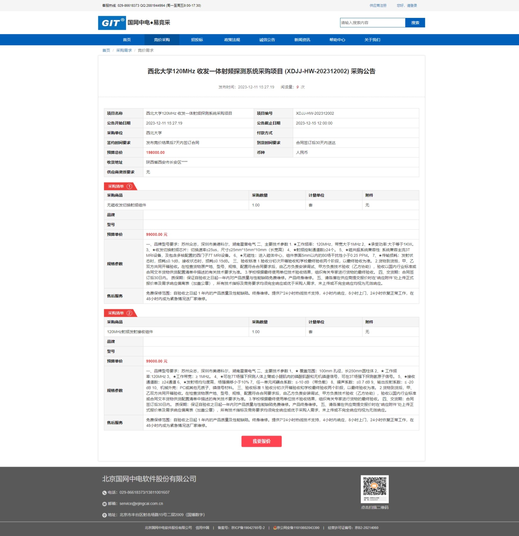 西北大学120MHz 收发一体射频探测系统采购项目 (XDJJ-HW-202312002) 采购公告 作者: 编辑: 时间:2023-12-12 原公告链接:https://www.ejingcai.com.cn/site/bidding/detail/7715