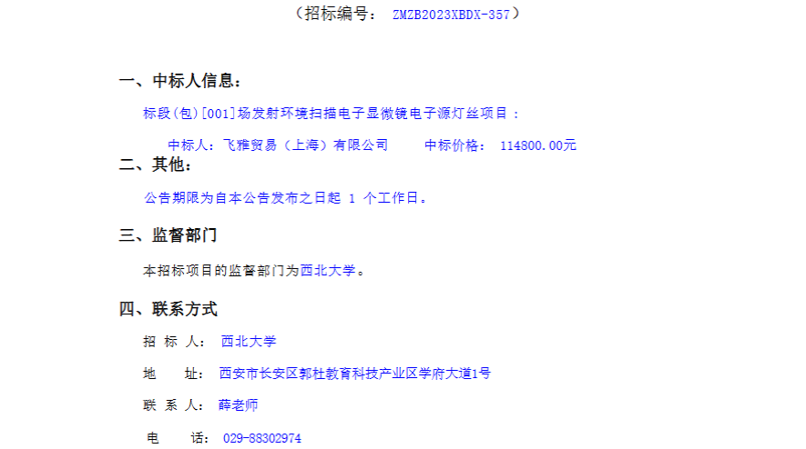西北大学场发射环境扫描电子显微镜电子源灯丝项目采购结果公告 作者: 编辑:采购与招标办公室 时间:2023-12-14 原公告链接:http://www.sntba.com/website/gg_show.aspx?id=263188