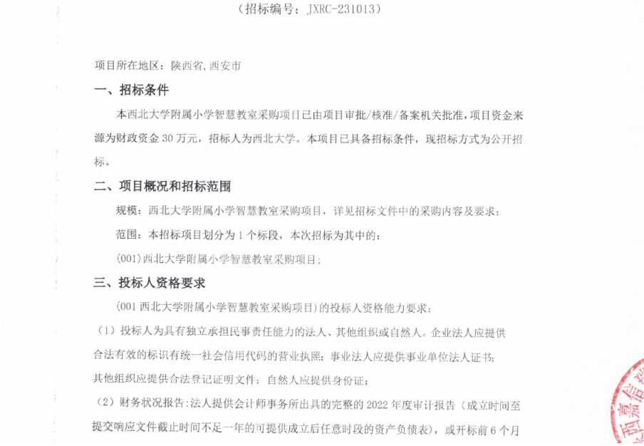 西北大学附属小学智慧教室采购项目公开招标公告 作者: 编辑:采购与招标办公室 时间:2023-12-15 原公告链接:http://bulletin.sntba.com/biddingBulletin/2023-12-15/913862.html