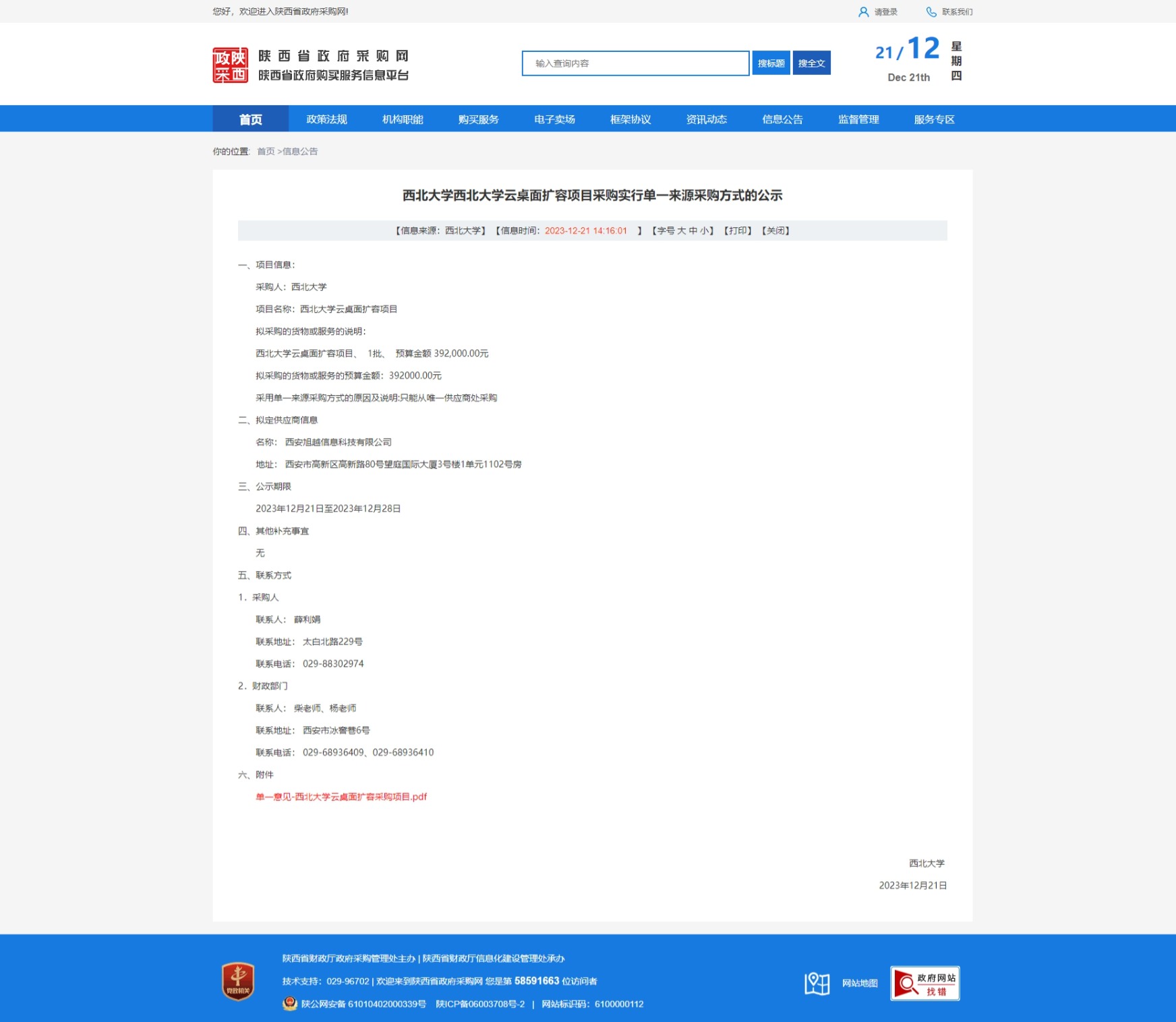 西北大学云桌面扩容项目采购实行单一来源采购方式的公示 作者: 编辑:采购与招标办公室 时间:2023-12-21 原公告链接:http://www.ccgp-shaanxi.gov.cn/freecms/site/shaanxi/ggxx/info/2023/8a69c16c8c86bcea018c8afd06910a33.html?noticeType=001051¬iceId=dae76602-9fc9-11ee-9a8e-08c0eb20c666