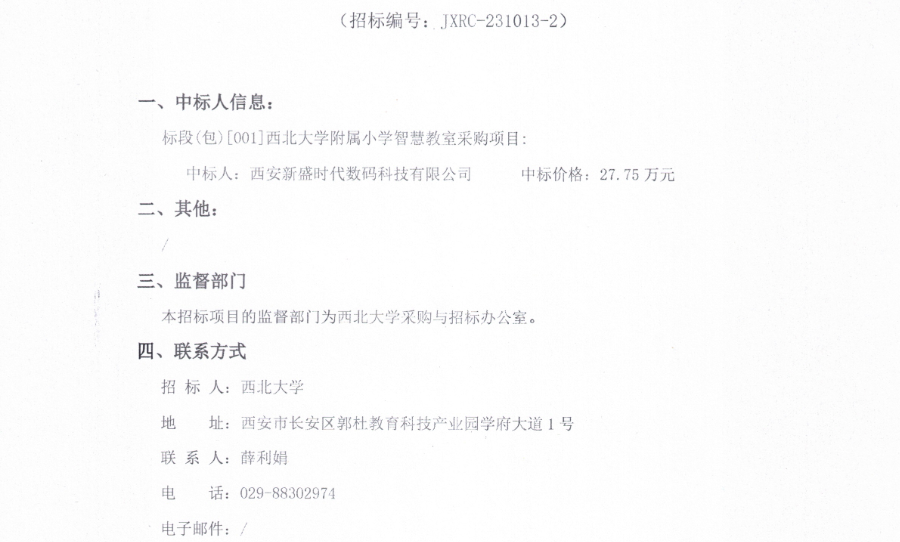 西北大学附属小学智慧教室采购项目(二次)中标结果公告 作者: 编辑:采购与招标办公室 时间:2024-03-05 原公告链接:http://bulletin.sntba.com/resultBulletin/2024-03-05/1173145.html