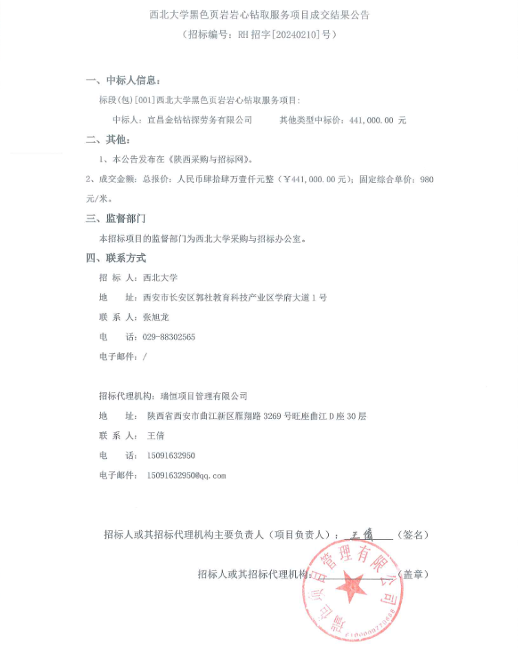 西北大学黑色页岩岩心钻取服务项目成交结果公告
