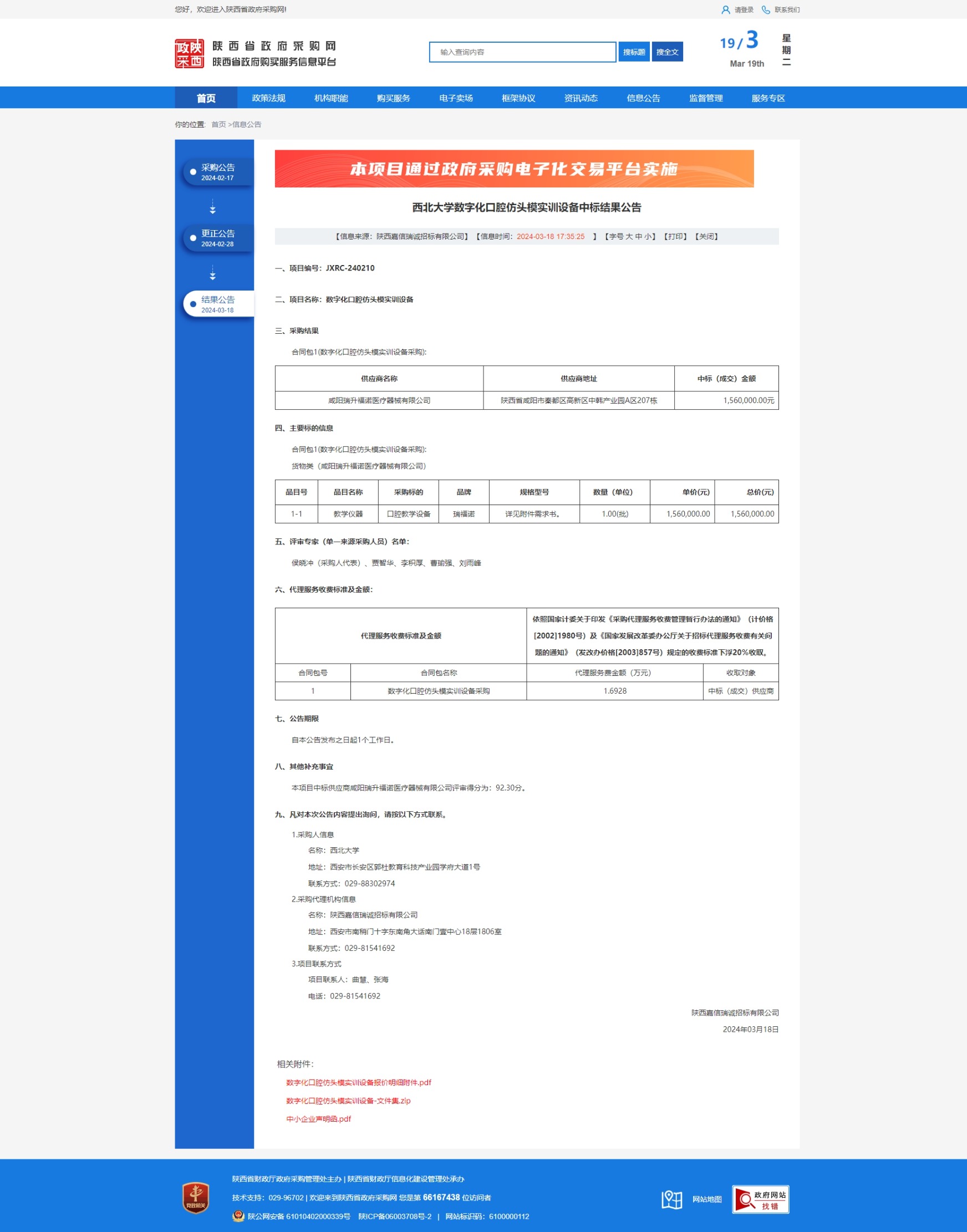 西北大学数字化口腔仿头模实训设备中标结果公告 作者: 编辑:采购与招标办公室 时间:2024-03-19 原公告链接:https://www.ccgp-shaanxi.gov.cn/freecms/site/shaanxi/ggxx/info/2024/8a69c7f58e463d37018e50cd061a2aef.html?noticeType=001021¬iceId=fbf978e2-e50b-11ee-b8b6-08c0eb20c666