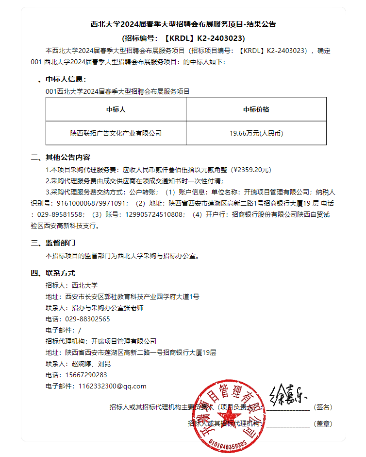 西北大学2024届春季大型招聘会布展服务项目结果公告