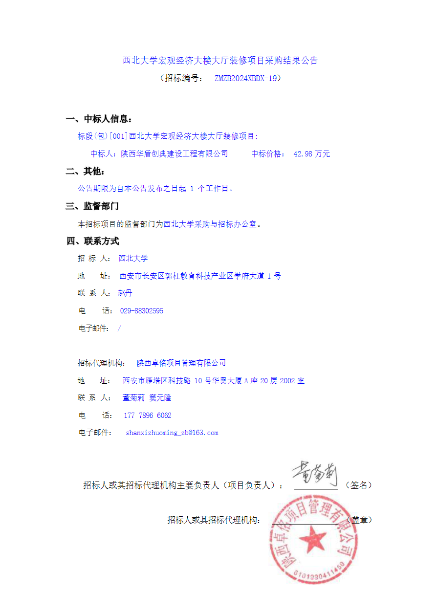 西北大学宏观经济大楼大厅装修项目采购结果公告