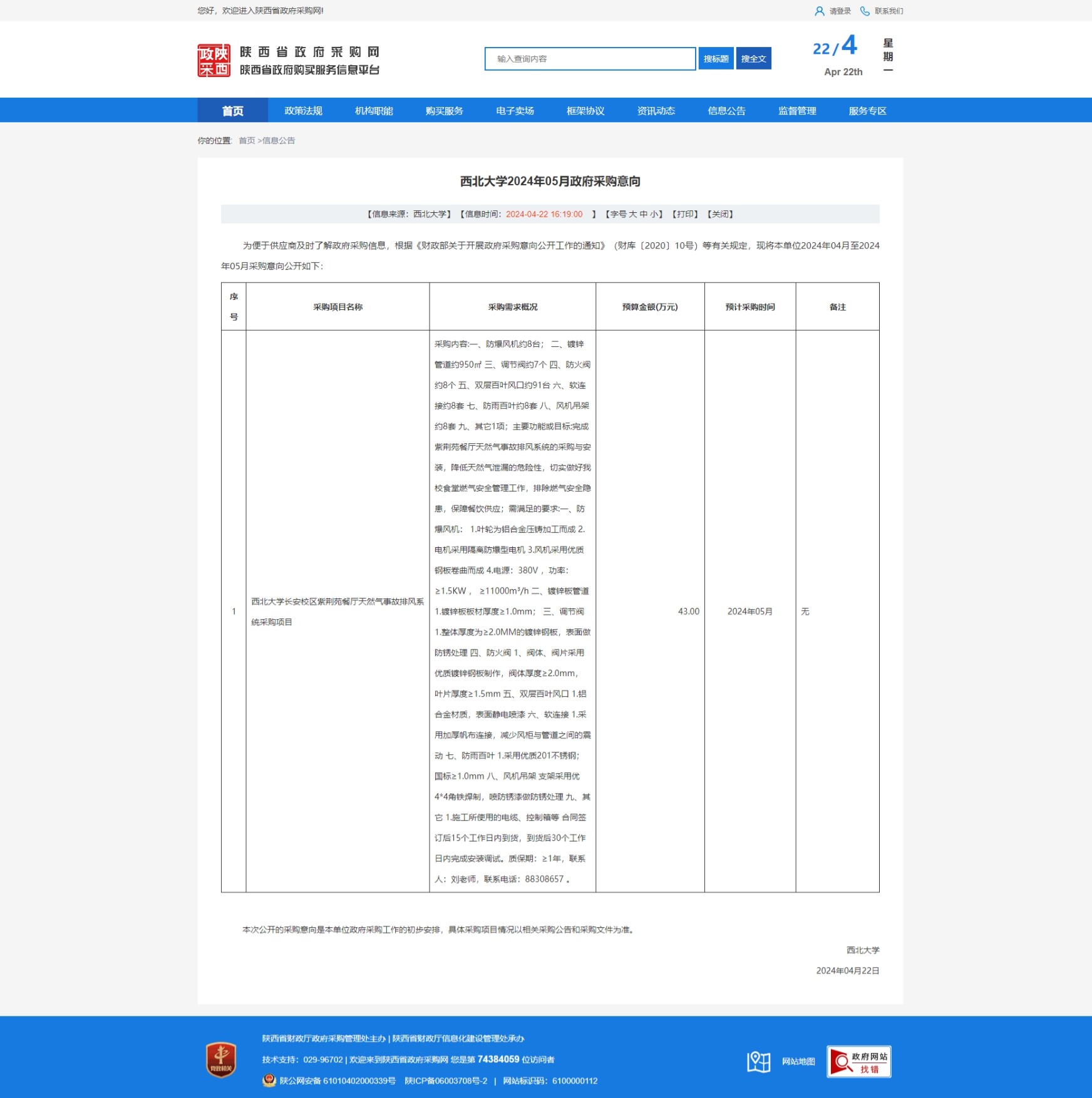 西北大学2024年05月政府采购意向 作者: 编辑:采购与招标办公室 时间:2024-04-22 原公告链接:https://www.ccgp-shaanxi.gov.cn/freecms/site/shaanxi/ggxx/info/2024/8a69c2f18edfb8e9018f034a758507c8.html?noticeType=59¬iceId=6c449ff0-0083-11ef-b8b6-08c0eb20c666
