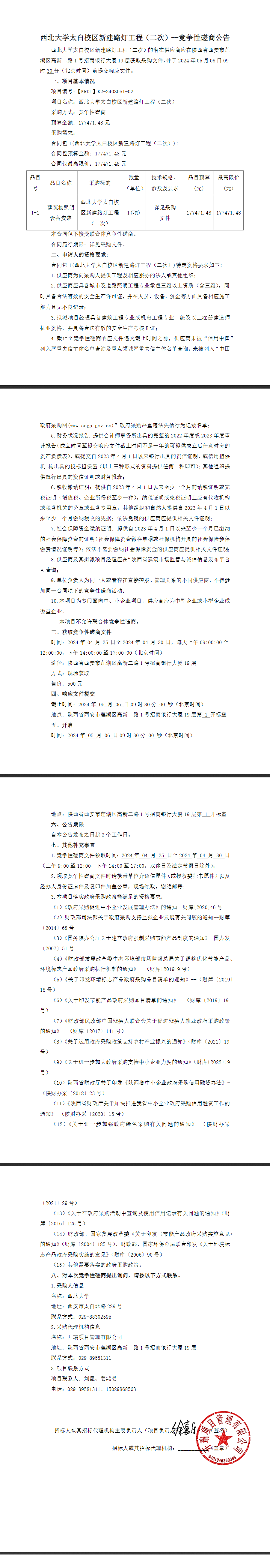 西北大学太白校区新建路灯工程(二次)竞争性磋商公告