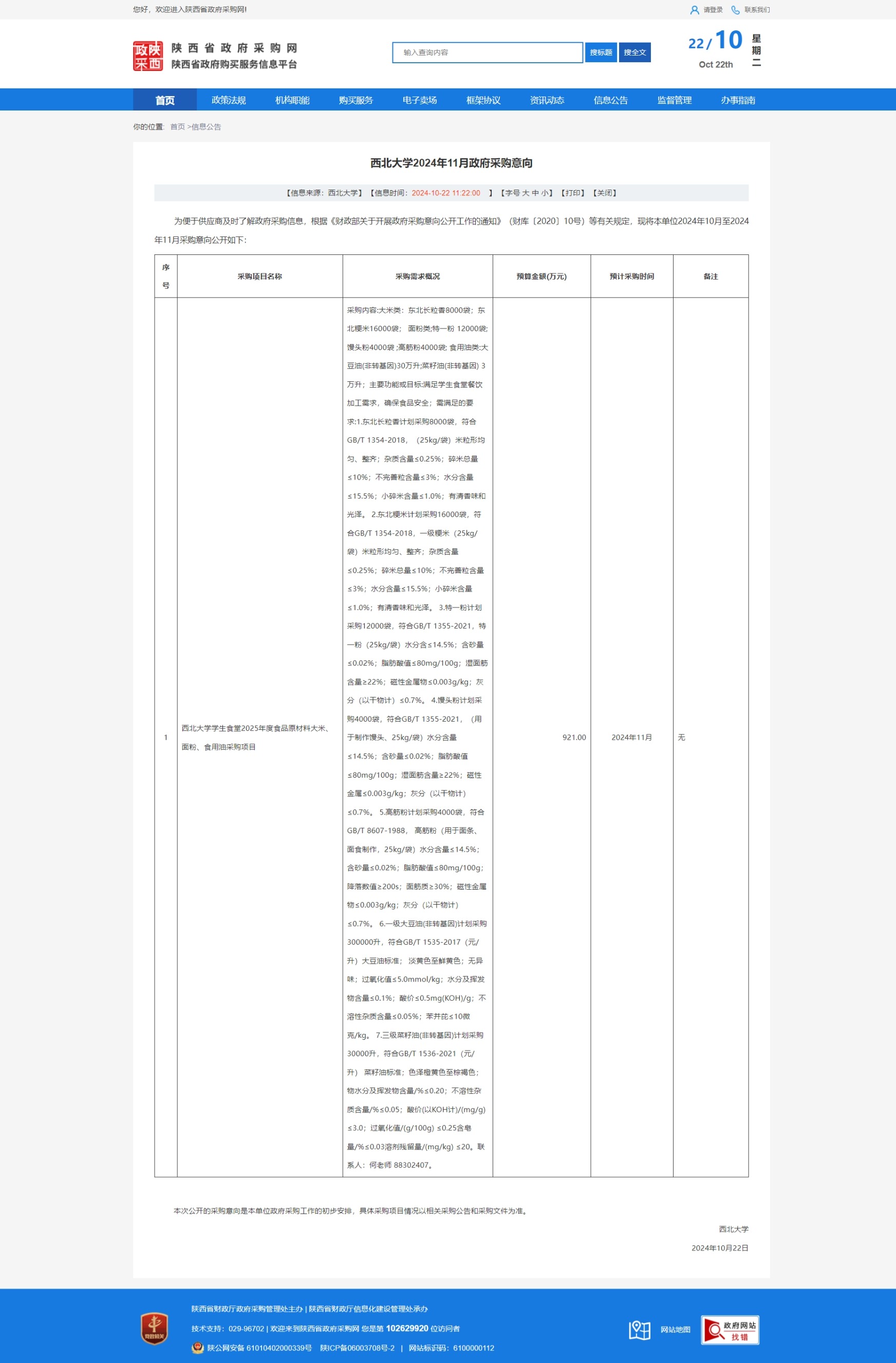 西北大学2024年11月政府采购意向(后勤集团食堂米面油项目) 作者: 编辑:采购与招标办公室 时间:2024-10-22 原公告链接:https://www.ccgp-shaanxi.gov.cn/freecms/site/shaanxi/ggxx/info/2024/8a69c95c927dd5a50192b23d9b3031d6.html?noticeType=59¬iceId=5795f07a-9026-11ef-8063-08c0eb20c666