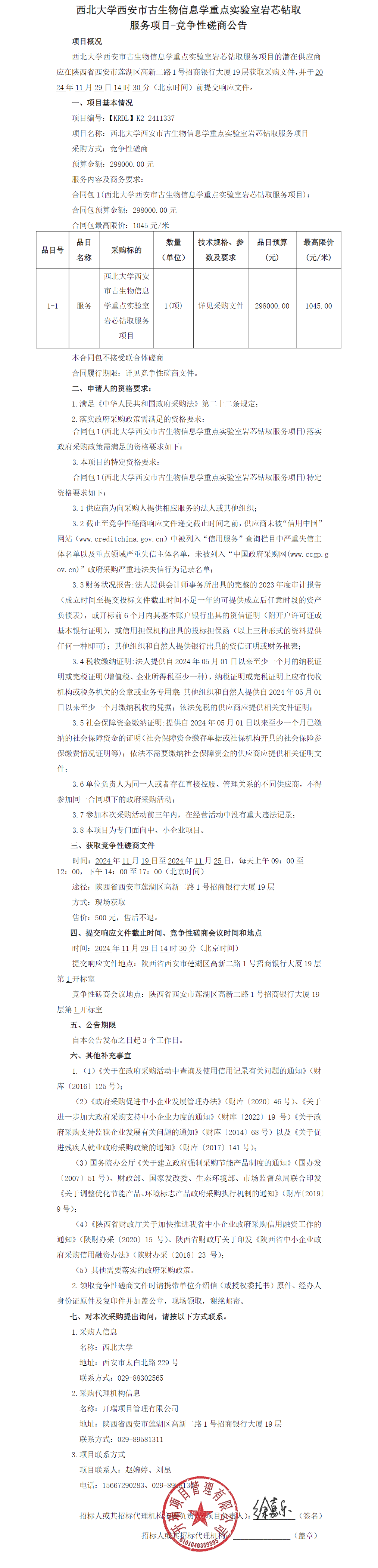 西北大学西安市古生物信息学重点实验室岩芯钻取服务项目竞争性磋商公告