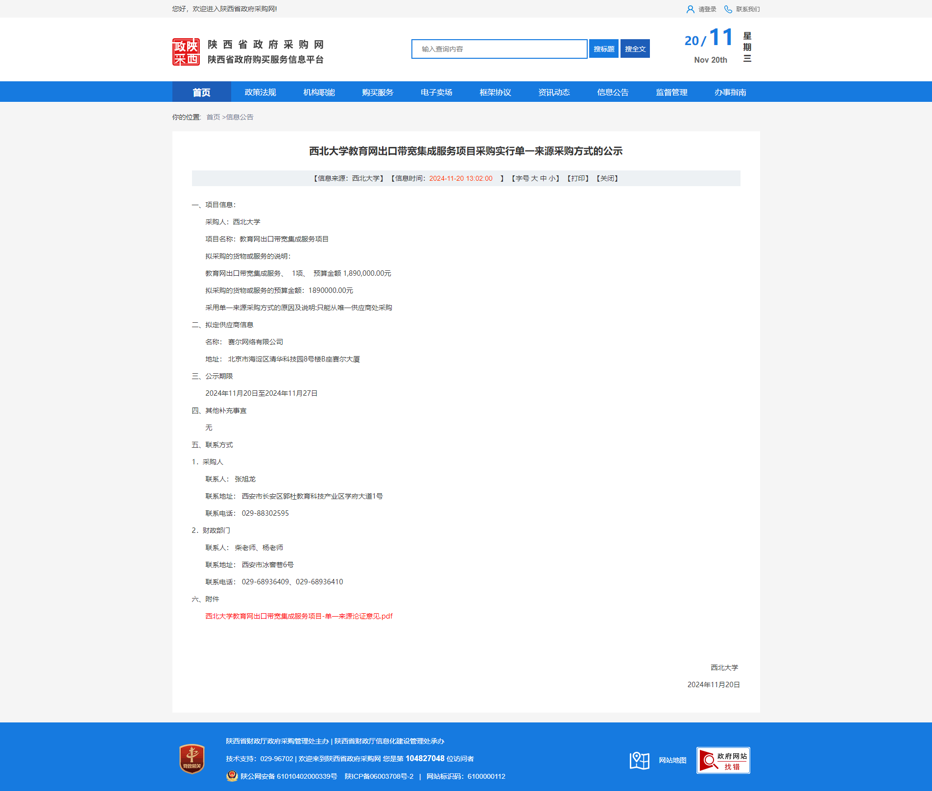 西北大学教育网出口带宽集成服务项目采购实行单一来源采购方式的公示