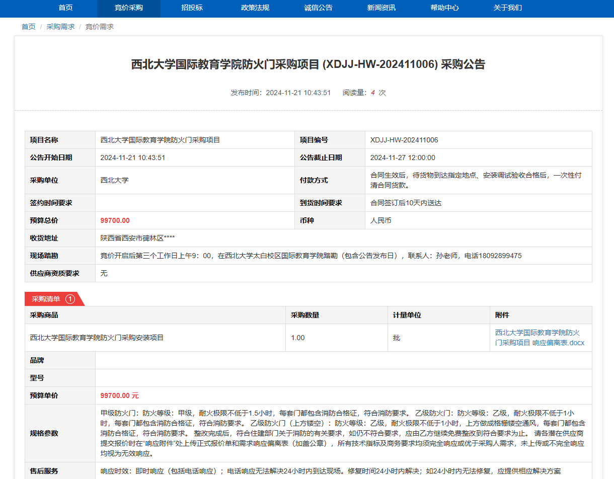 西北大学国际教育学院防火门采购项目(XDJJ-HW-202411006)竞价采购公告 作者:采购与招标办公室 编辑: 时间:2024-11-21 原公告链接:https://www.ejingcai.com.cn/site/bidding/detail/15182