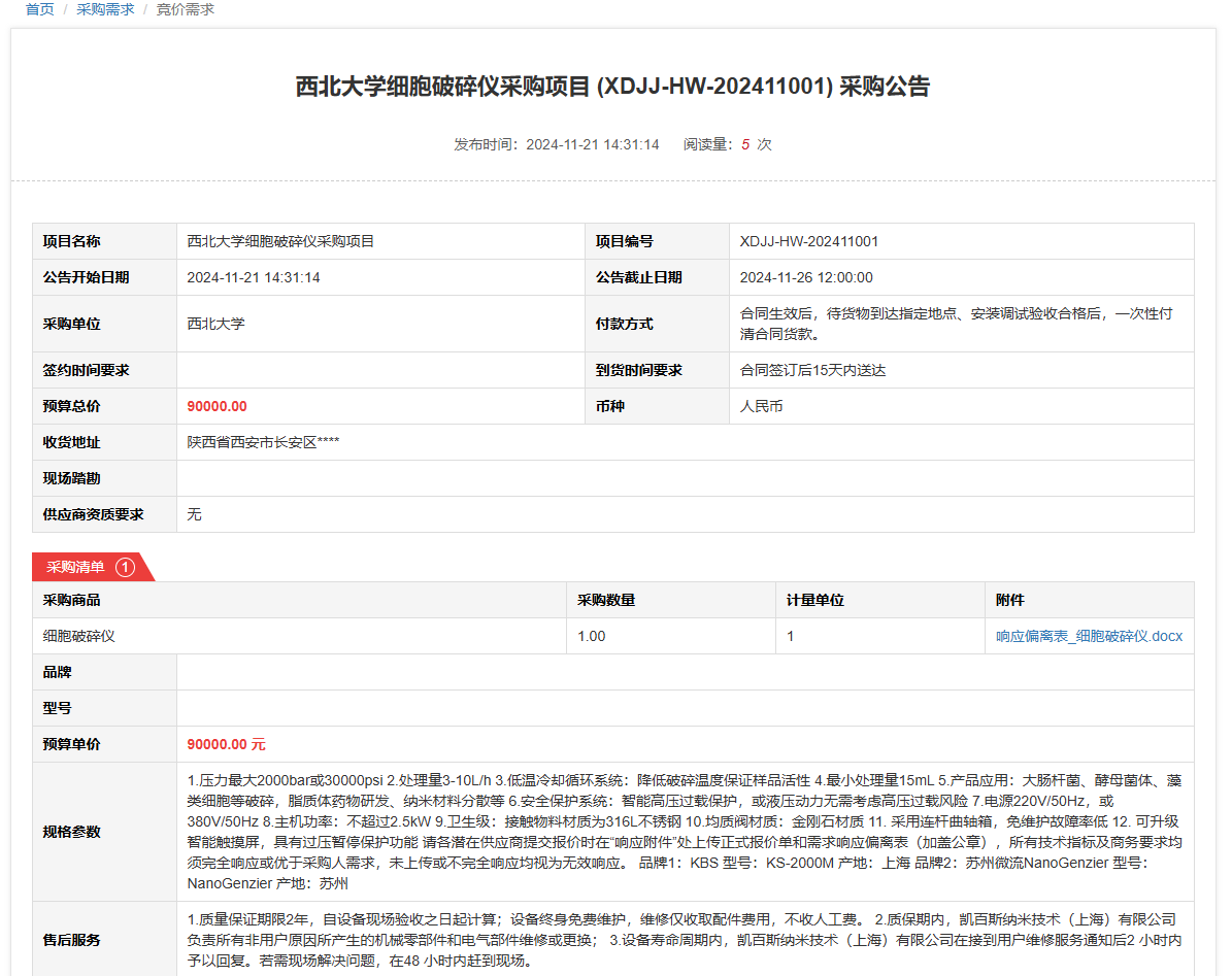 西北大学细胞破碎仪采购项目(XDJJ-HW-202411001)竞价采购公告 作者:采购与招标办公室 编辑: 时间:2024-11-21 原公告链接:https://www.ejingcai.com.cn/site/bidding/detail/15200